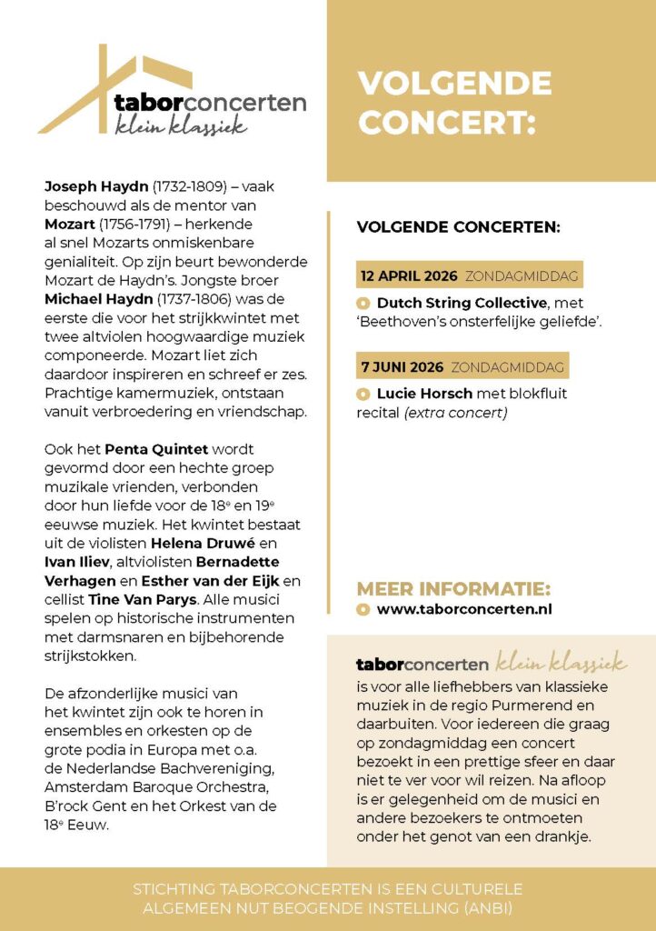 Het Penta Quintet brengt deze muziek tot leven op historische instrumenten met darmsnaren. Het kwintet bestaat uit violisten Helena Druwé en Ivan Iliev, altviolisten Bernadette Verhagen en Esther van der Eijk, en cellist Tine Van Parys — vijf muzikale vrienden verenigd door hun passie voor muziek uit de 18e en 19e eeuw.